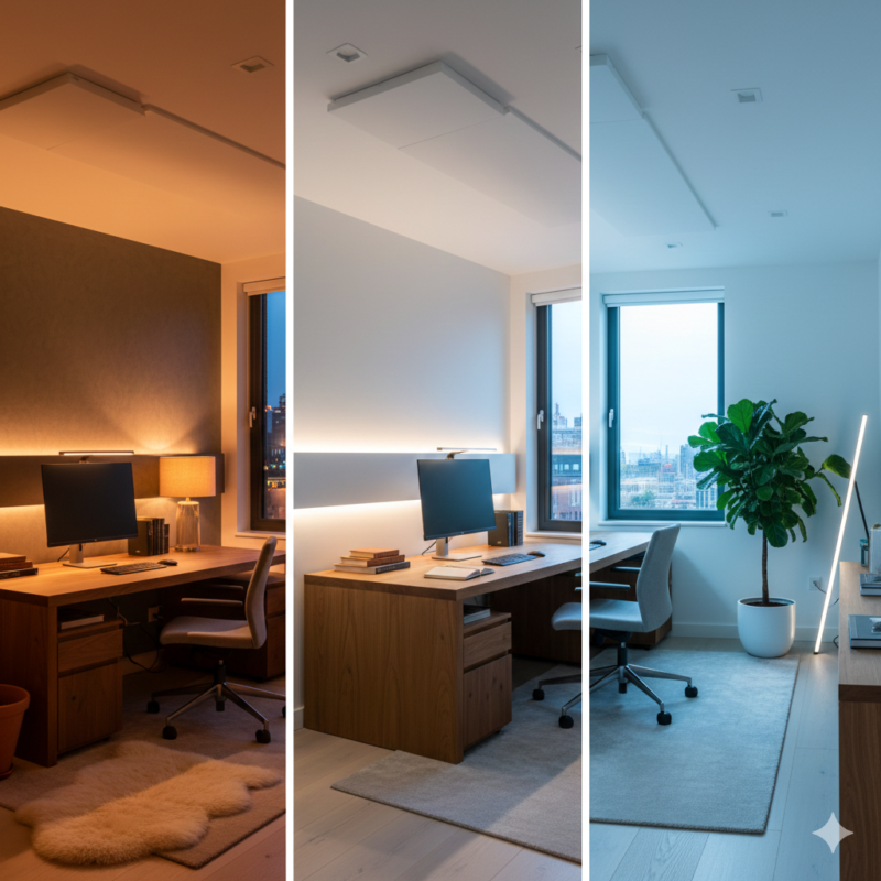 ไฟหลัก (Ambient Light): ควรเป็นโคมไฟฝังฝ้าที่กระจายแสงสม่ำเสมอทั่วห้อง เพื่อไม่ให้เกิดมุมมืดที่ตัดกับหน้าจอคอมพิวเตอร์ที่สว่างจ้า เพราะความแตกต่างของแสงที่มากเกินไปจะทำให้ม่านตาต้องทำงานหนักตลอดเวลาจนเกิดอาการตาล้า