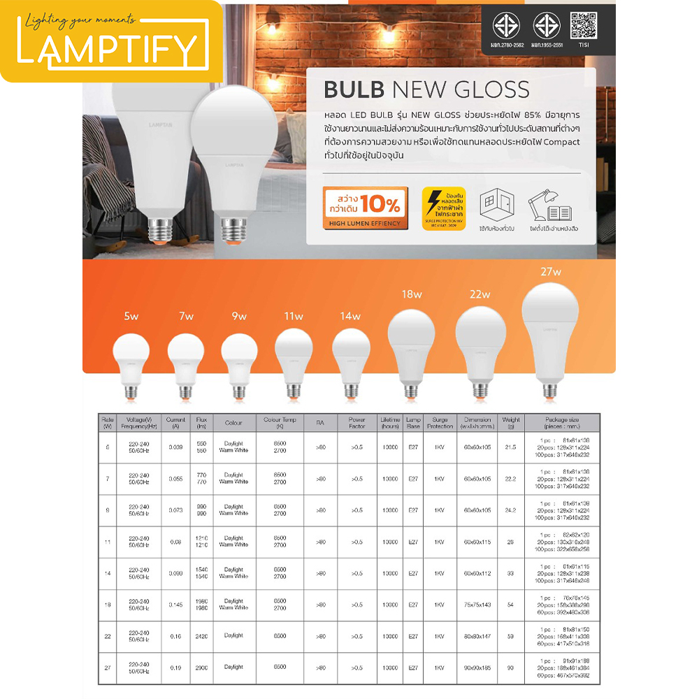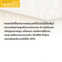 หลอดไฟ LED ประหยัดพลังงาน ลดค่าไฟได้ถึง 85% เปิดติดทันที แสงสว่างเต็มประสิทธิภาพ ไม่มีรังสียูวี ใช้แทนหลอดเดิมได้ทันทีด้วยขั้วมาตรฐาน E27 (220-240V)